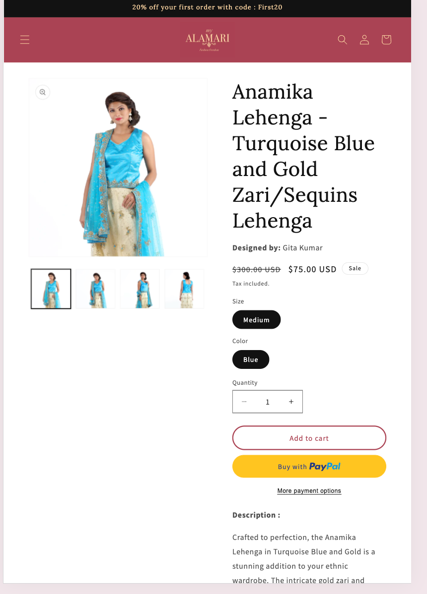 Your journey with My Alamari starts with a few clicks 1. Browse the catalog to find the luxurious ethnic dress 2. Select your size and checkout 3. Order is shipped to your doorstep hassle free