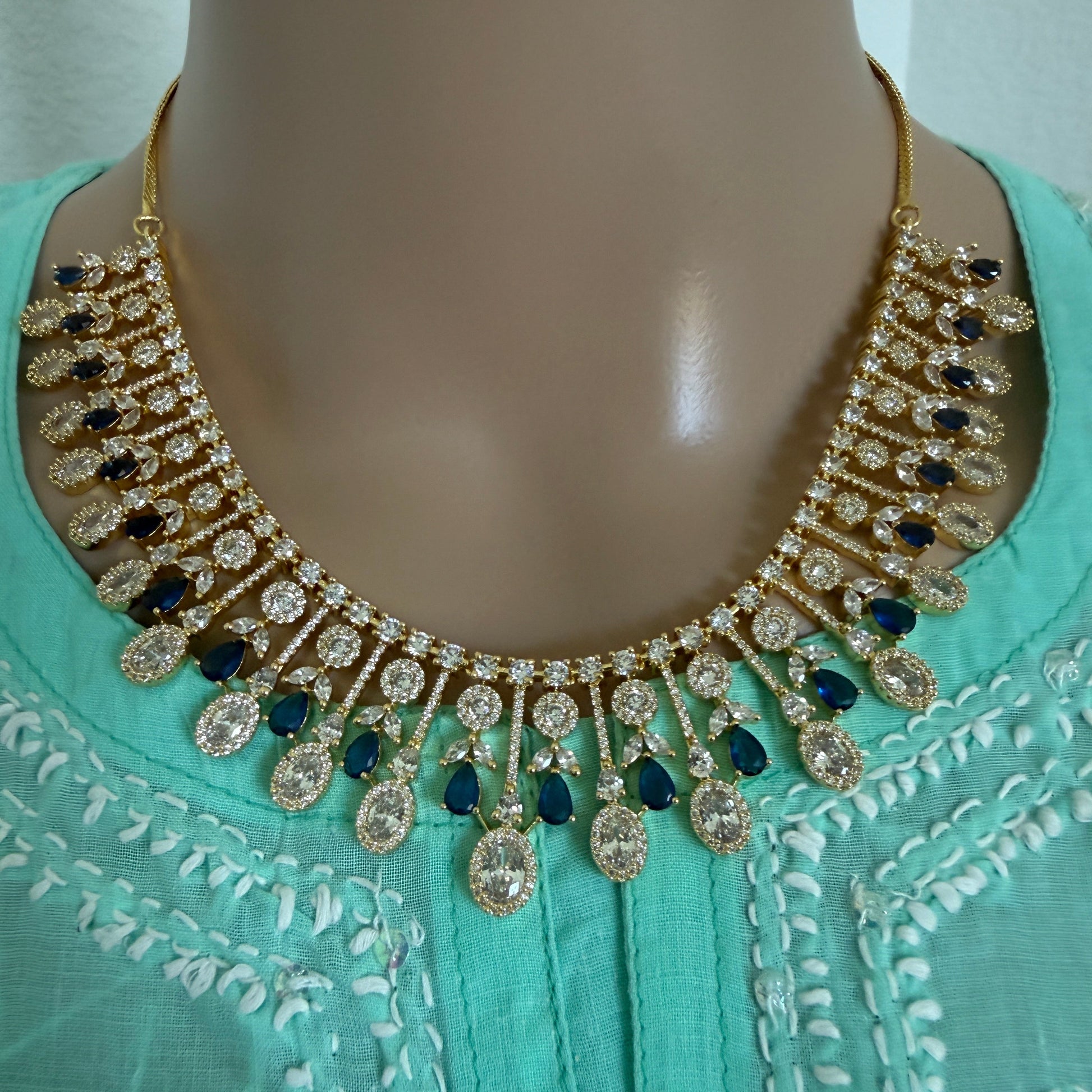 Elevate your style with the stunning Royal Blue Crystal Drop Gold-Tone Necklace, designed to add elegance and sparkle to any outfit. Featuring brilliant white crystals paired with rich royal blue teardrop stones, this necklace creates a beautiful cascading design that enhances the neckline with a luxurious touch.