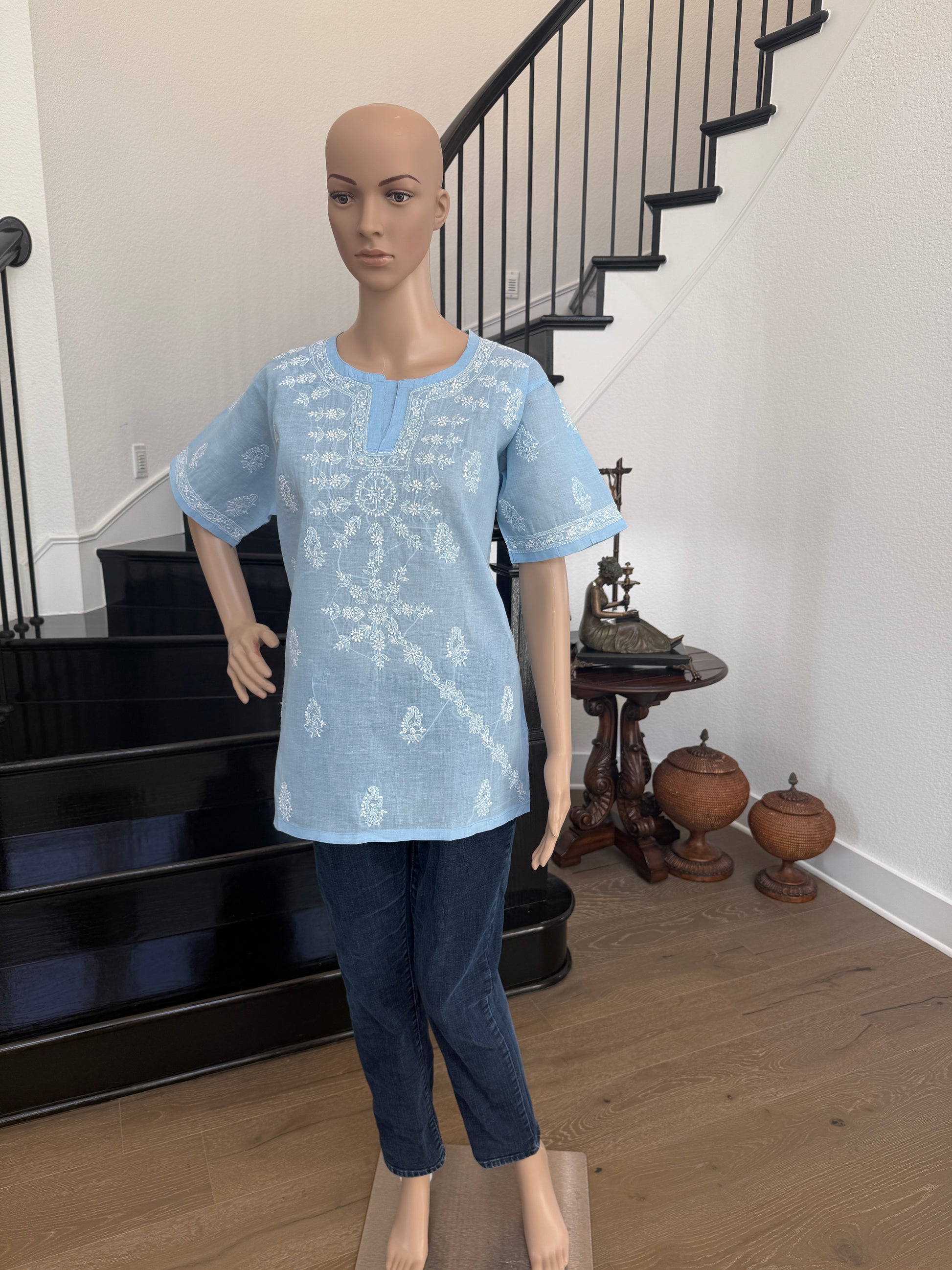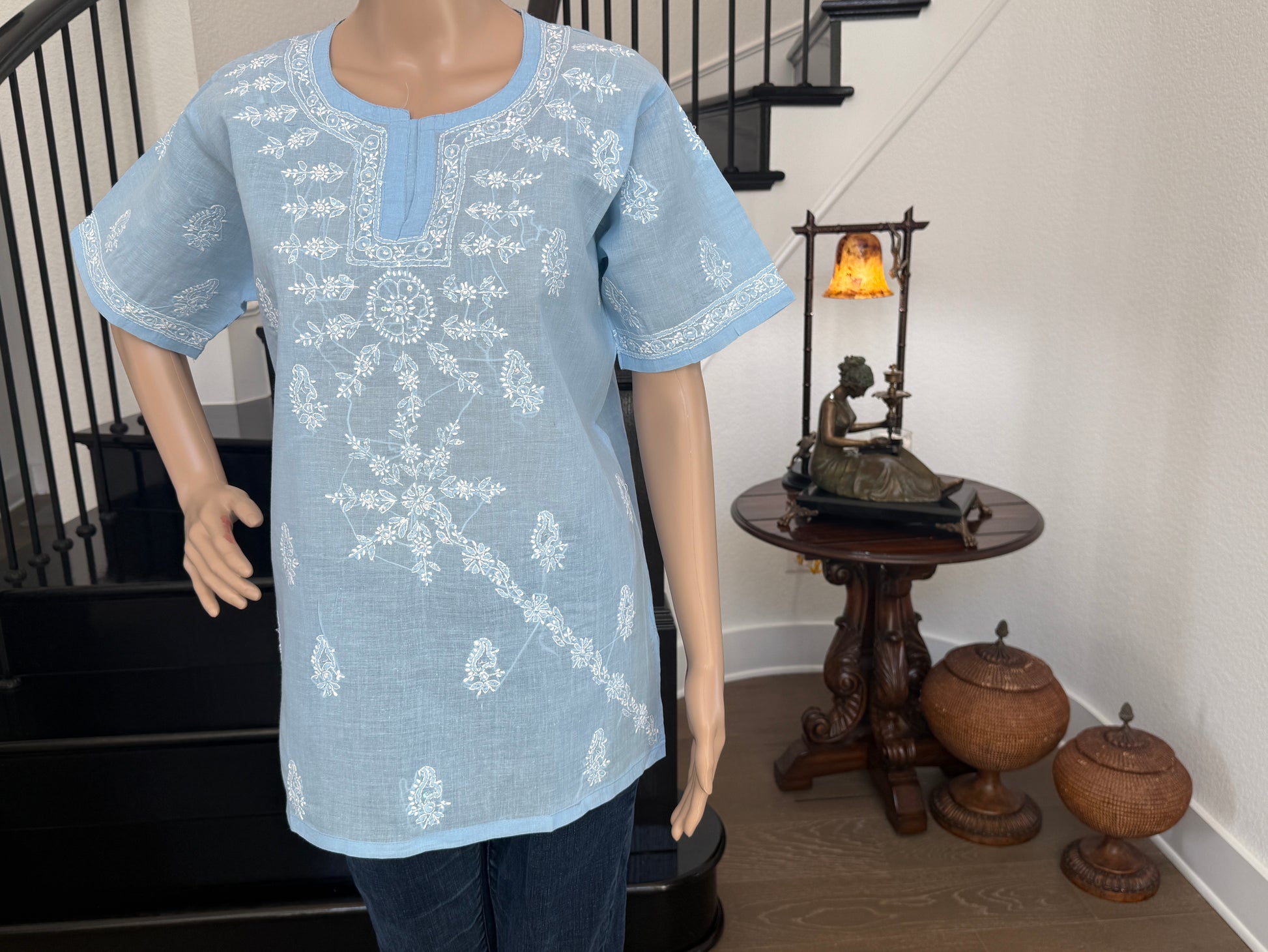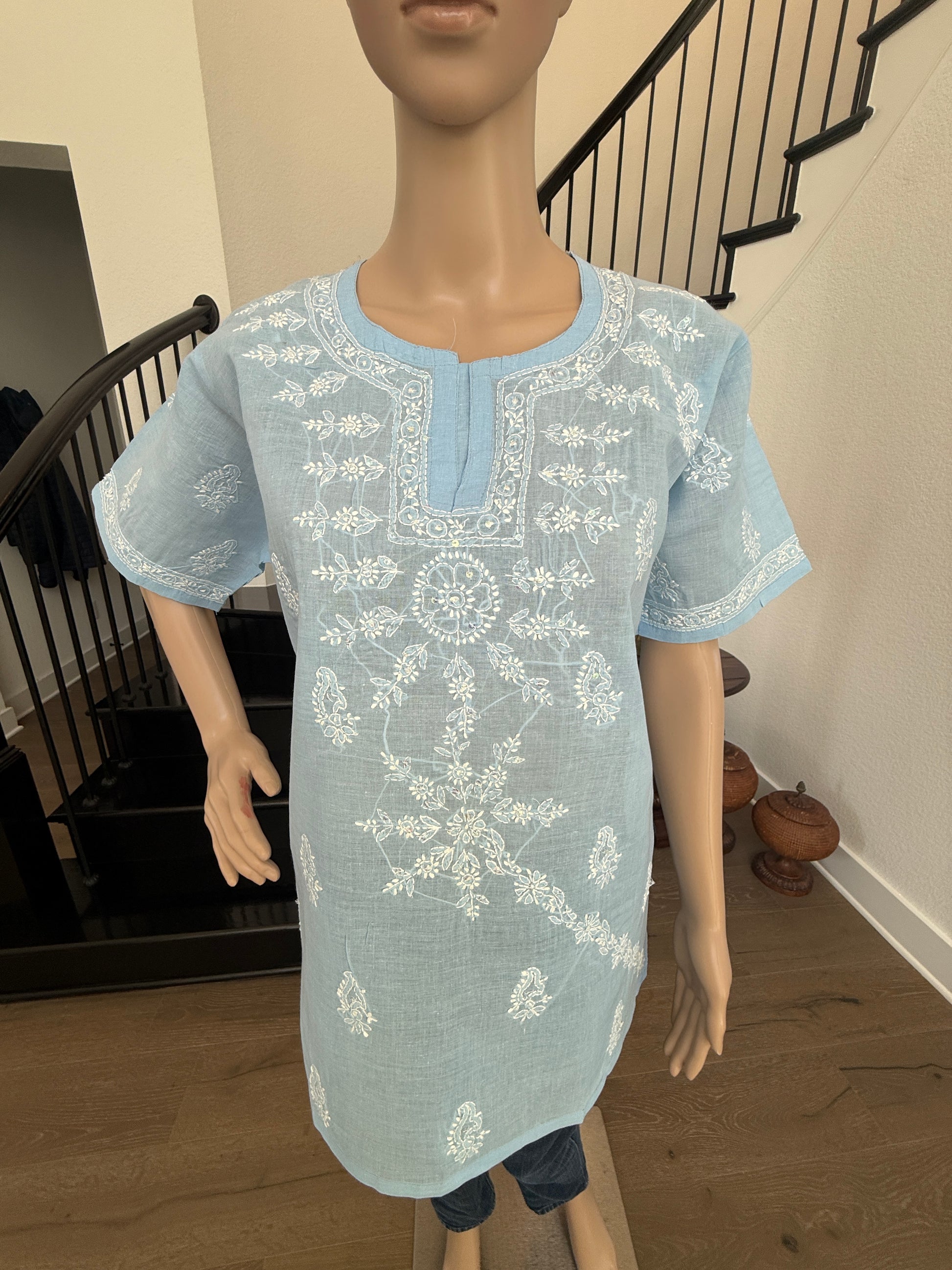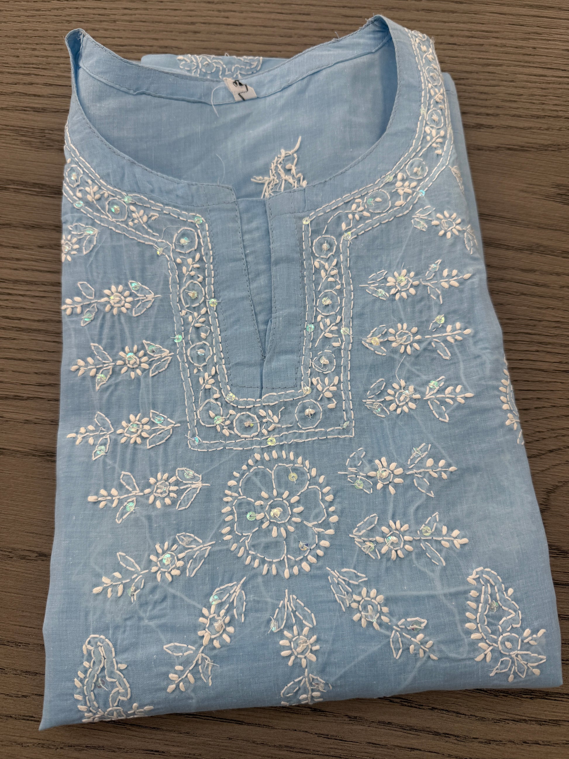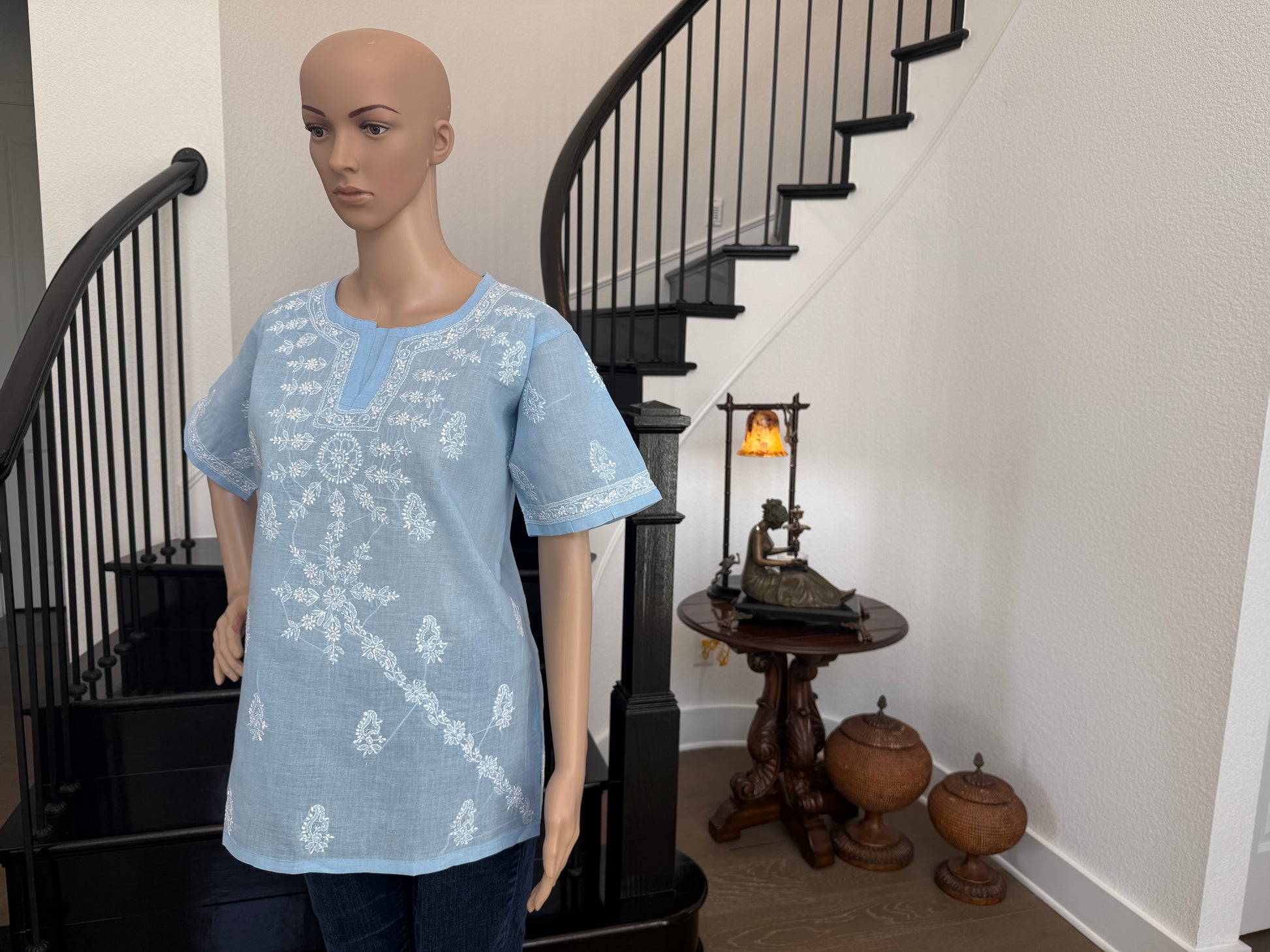 Be a fashionista with our Nina Sky blue chikankari kurta! Hand-embroidered from Lucknow, India, this kurta features beautiful sky blue chikankari. Pair it with large gold earrings and sandals for an effortlessly chic look. (Made in Lucknow, India)