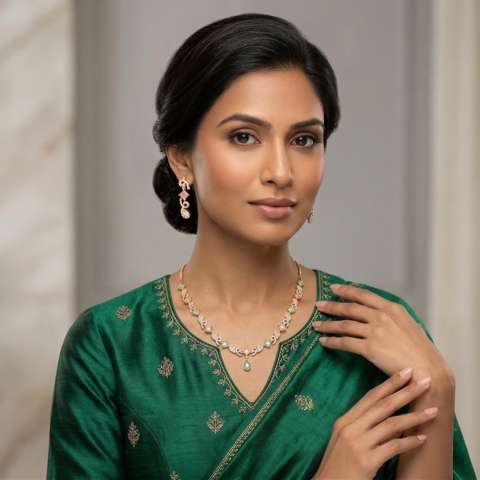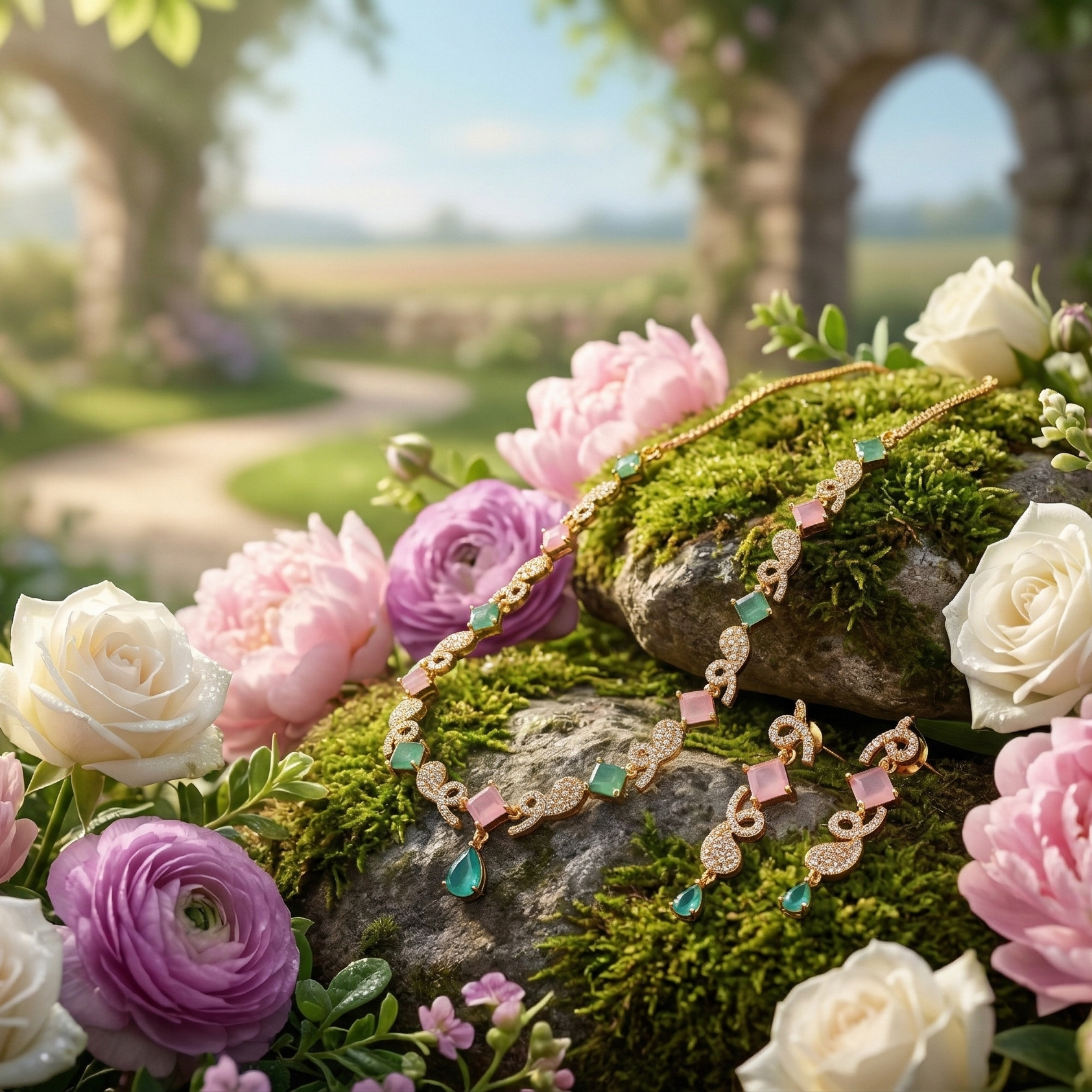 Experience elite luxury with the 'Pastel Elegance' set. Designed for the modern wardrobe, this high-fashion design is perfect for elevating your look. This set features a delicate arrangement of soft pink and mint green crafted stones, flawlessly interspersed with intricate, sparkling gold-tone links.