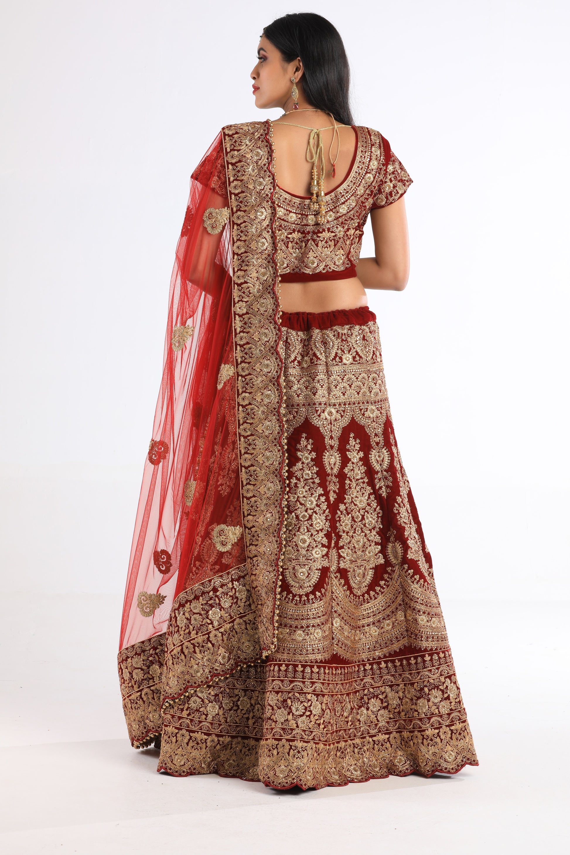 Blood red velvet embroidered lehenga in resham cut dana zari moti and zardosi embroidery in floral and geometric motif with long tassel. Elevate your look with our luxurious Rani Blood Red Lehenga. The intricate design features delicate floral and geometric motifs, meticulously crafted with resham cut dana, zari, and moti embroidery. Each piece is adorned with long tassels, adding a touch of elegance and opulence to your ensemble. Crafted with care and precision, our lehenga is perfect for any occasion and will make you feel like royalty.